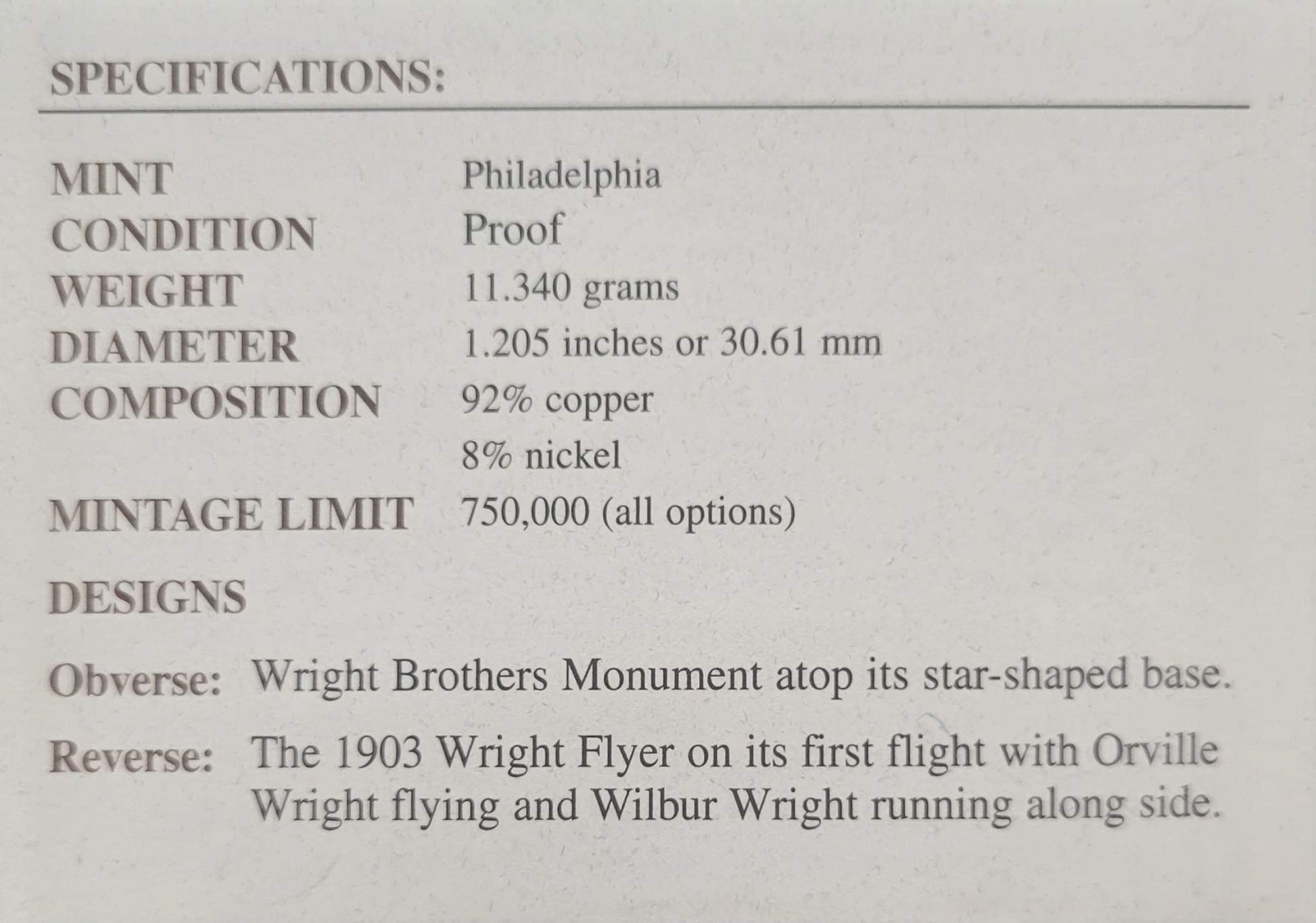 This 2004 first flight centennial commemorative coin is certified proof clad Half Dollar. The obverse of the coin presents a John Mercanti engraved Wright Brothers Monument atop its star-shaped base with "Liberty" above "In God We Trust" to the left and "Wright Monument" and "2003" below. The reverse of the coin presents a Donna Weaver design of the 1903 Wright Flyer on its first flight with Orville Wright flying and Wilbur Wright running along side with "United States of America" and "E Pluribus Unum" above and "Half Dollar" below. This coin also comes with a collectable box and a certificate of authenticity signed by Henrietta Holsman Fore, Director United States Mint.